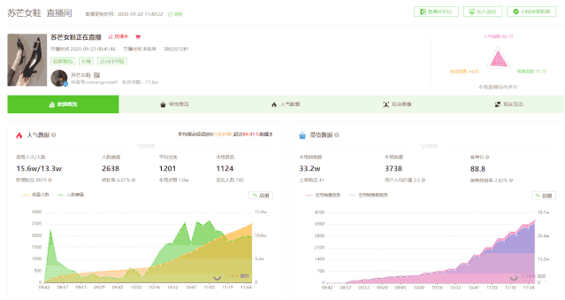 我们点进「苏芒女鞋」的直播间,可以看到这场直播从8点41开始,目前仍在直播中,直播间观看人数达到13.3万人,平均在线1200+,平均停留时长在1分37秒,直播整体活跃度较高。