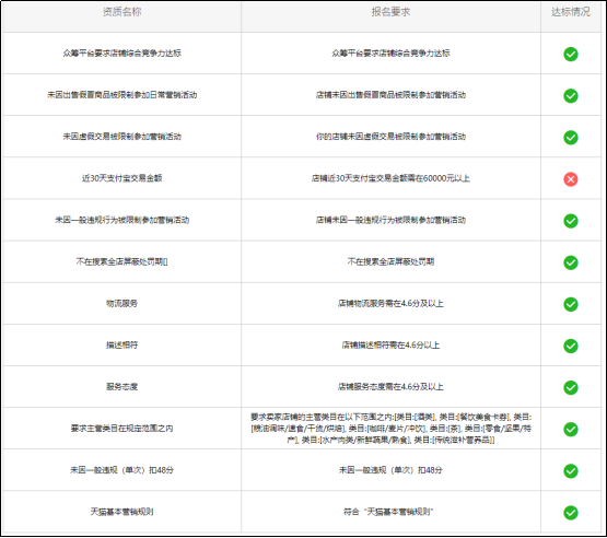 上面四图分别是科创设计、文体娱乐、食品生鲜、公益其他四大类的申请要求,其中食品生鲜类目对于申请店铺支付宝有近30天60000元流水的要求。